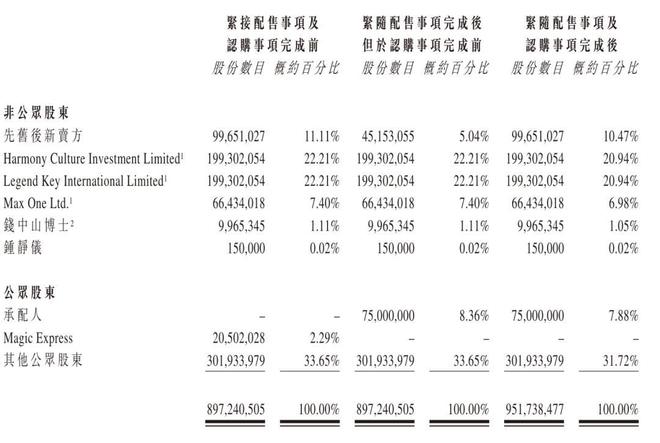 配售后,Harmony Culture Investment、Legend Key International分别持股20.94%;Max One Ltd持股为6.98%,钱中山持股为1.05%,赖国辉持股为10.47%,钟静仪持股为0.02%,Magic Express不再持股。