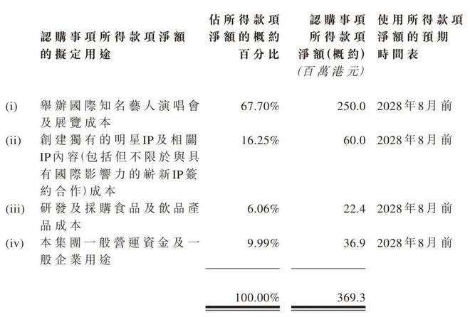 巨星传奇计划2.5亿元用于举办国际知名艺人演唱会及展览成本,6000万元用于创建独有的明星IP及相关IP内容(包括但不限于与具有国际影响力的崭新IP签约合作)成本,2240万元用于研发及采购食品及饮品产品成本,3690万元用于集团一般营运资金及一般企业用途。