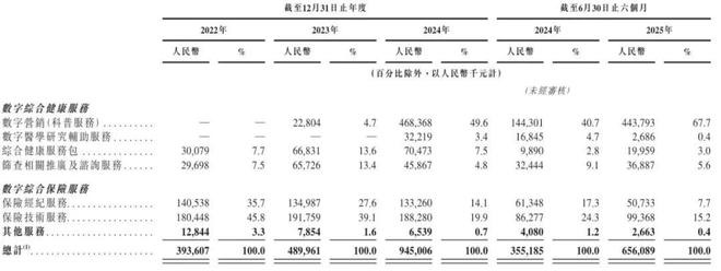 轻松健康集团2025年上半年来自保险经纪服务收入5073万,占营收的比例为7.7%;来自保险技术服务的收入为9937万元,占营收的比例为15.2%。