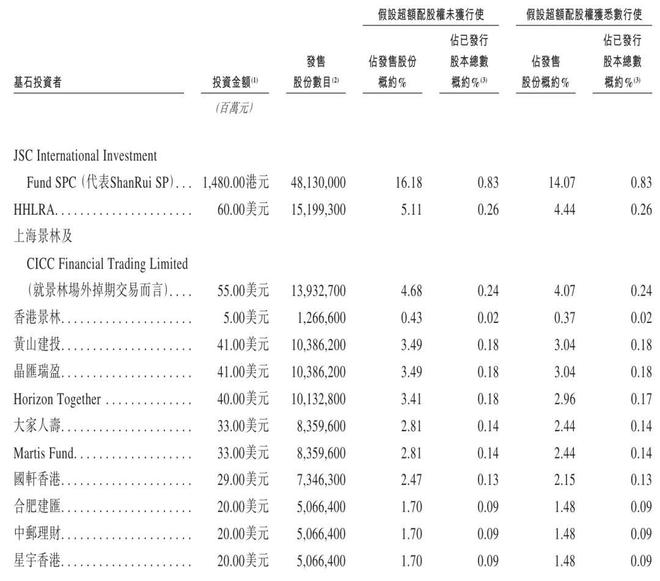 SC International Investment Fund SPC认购14.8亿港元,高瓴HHLRA认购6000万美元,上海景林及CICC Financial Trading Limited认购5500万美元,香港景林认购500万美元;