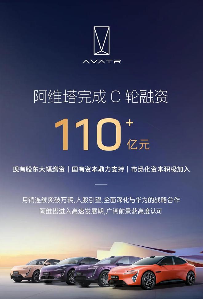 2024年12月底,阿维塔科技宣布完成C轮融资,募集资金超110亿元。本轮融资,由长安汽车、渝富系基金、南方资产系基金、国投系基金、交银投资以及其他战略和市场化投资人共同出资。