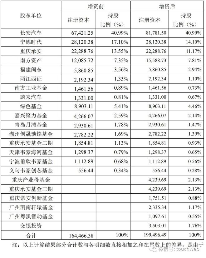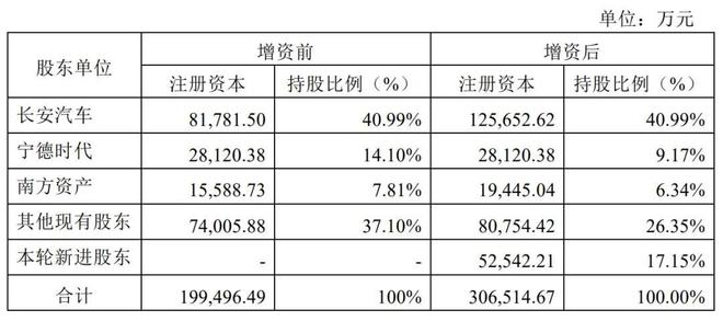其中,长安汽车增资45.51亿元,南方资产拟增资4亿元,重庆安渝私募股权投资基金合伙企业(有限合伙)(简称“安渝基金”)增资 28亿元,交银金融资产投资有限公司(简称“交银投资”)增资 7亿元,其他新进股东增资合计26.5亿元。