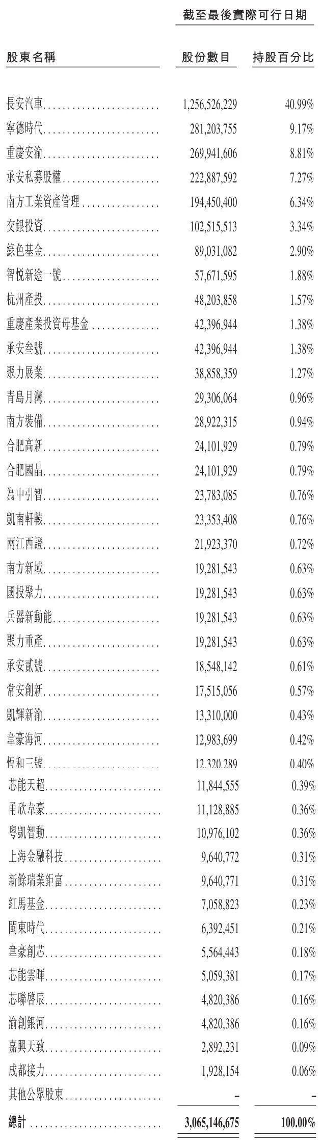 IPO前,长安汽车持股40.99%,宁德时代持股为9.17%,重庆安渝持股为8.81%,承安私募股权持股为7.27%,南方工业资产管理持股为6.34%,交银投资持股3.34%,绿色基金持股为2.9%,智悦新途一号持股为1.88%;