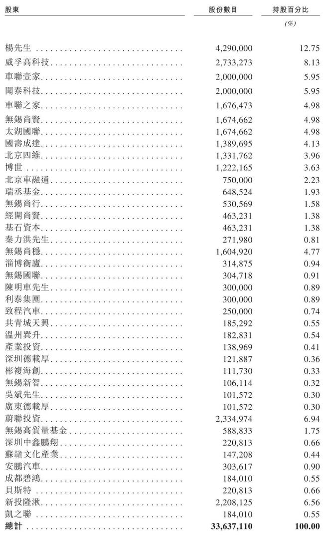 IPO前,杨泓泽持股为12.75%,车联壹家持股为5.95%,车联之家持股为4.98%,北京车融通持股为2.23%,蔚来总裁秦力洪持股为0.81%,陈明车、利泰集团分别持股为0.89%,秦致持股为0.74%,温州巽升持股为0.54%,深圳德载厚持股为0.36%,吴斌、广东德载厚分别持股为0.3%;