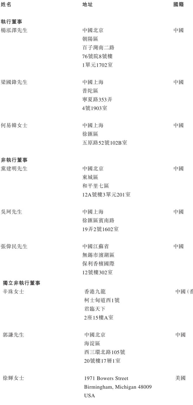 车联天下执行董事分别为杨泓泽、梁国锋、何易韩女士;非执行董事分别为党建明、吴珂、张伟民;独立非执行董事分别为辛珠女士、郭谦、徐辉女士。