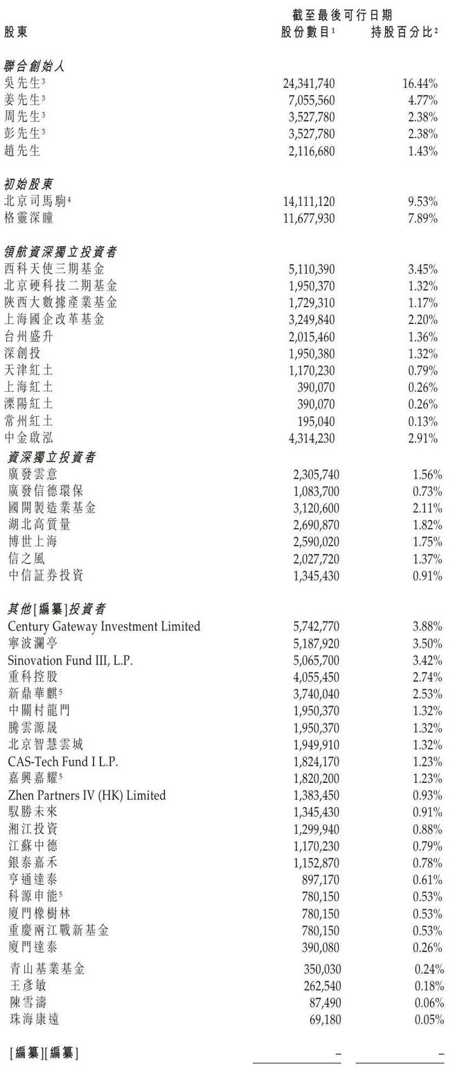 Zhen Partners IV(HK)Limited(真格基金)持股为0.93%,驭胜未来持股为0.91%,湘江投资持股为0.88%,江苏中德持股为0.79%,银泰嘉禾持股为0.78%,亨通达泰持股为0.61%,科源申能、厦门橡树林、重庆两江战新基金分别持股为0.53%。