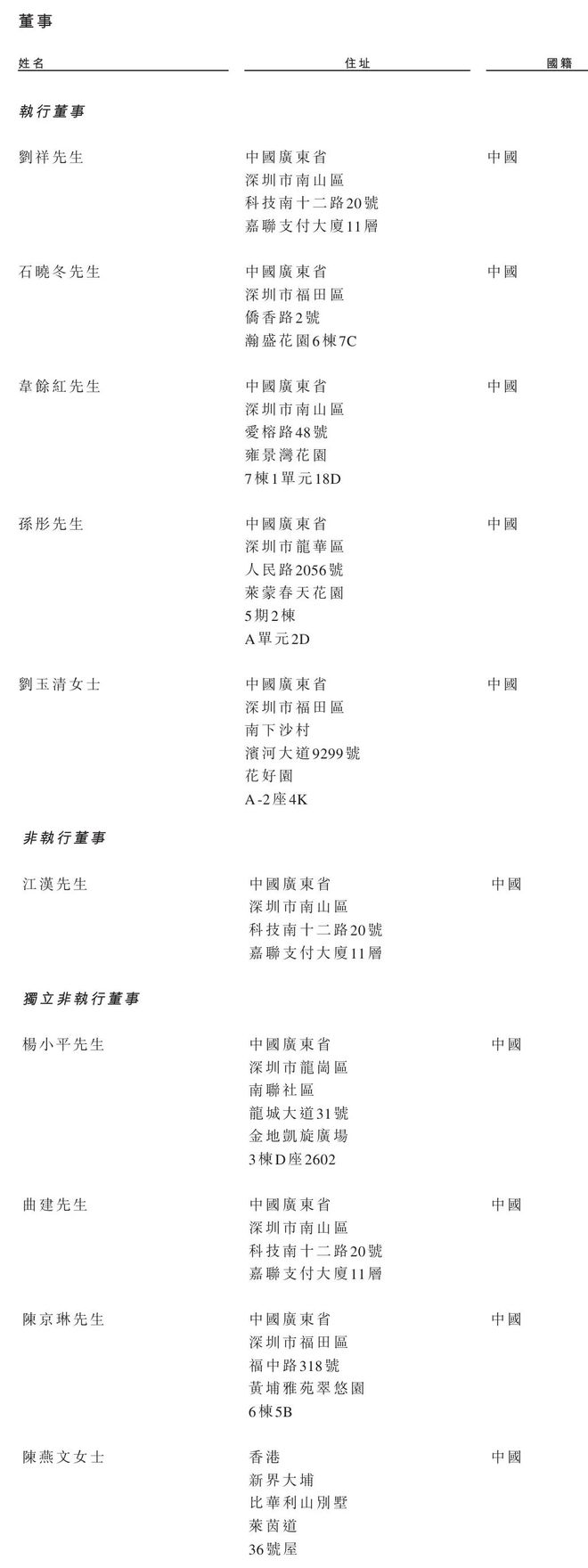 新国都执行董事分别为刘祥、石晓冬、韦余红、孙彤、刘玉清女士;非执行董事为江汉,独立非执行董事分别为杨小平、曲建、陈京琳、陈燕文女士。