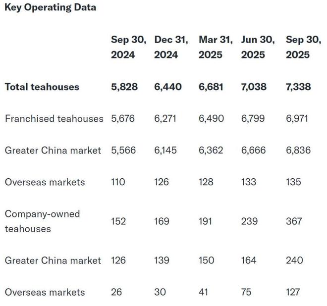截至2025年9月30日第三季度,霸王茶姬全球门店数达7338家,较上年同期增25.9%。霸王茶姬2025年第三季总GMV达79.30亿,净收入32.08亿,经调整后净利润为5.03亿。