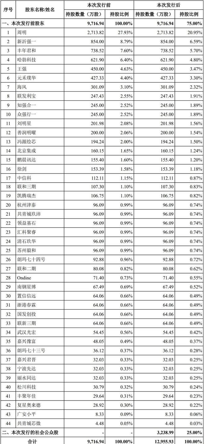 IPO后,周明持股为20.95%,新沂强一持股为6.59%,丰年君和持股为5.7%,华为旗下哈勃科技持股为4.8%,王强持股为3.47%,元禾璞华持股为3.3%,海风持股为2.32%,联发利宝持股为1.91%,知强合一、众强行一分别持股为1.89%,刘明星持股为1.56%;