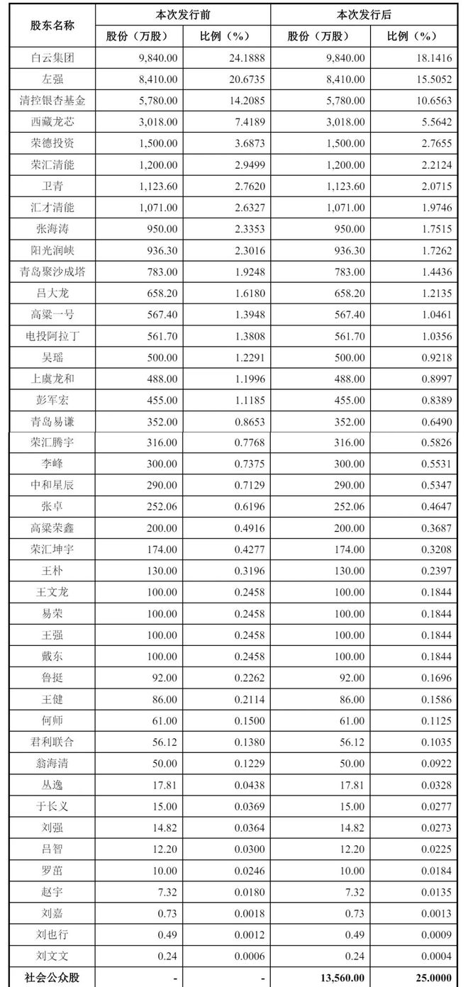 IPO后,白云集团持股18.1416%,左强持股为15.5052%,清控银杏基金持股为10.6563%,西藏龙芯持股为5.5642%,荣德投资持股为2.7655%,荣汇清能持股为2.2124%;