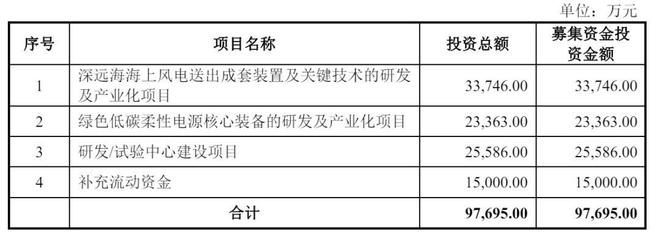 荣信汇科计划募资9.77亿元,其中,3.37亿元用于深远海海上风电送出成套装置及关键技术的研发及产业化项目,2.33亿元用于绿色低碳柔性电源核心装备的研发及产业化项目,2.56亿元用于研发/试验中心建设项目,1.5亿元用于补充流动资金。