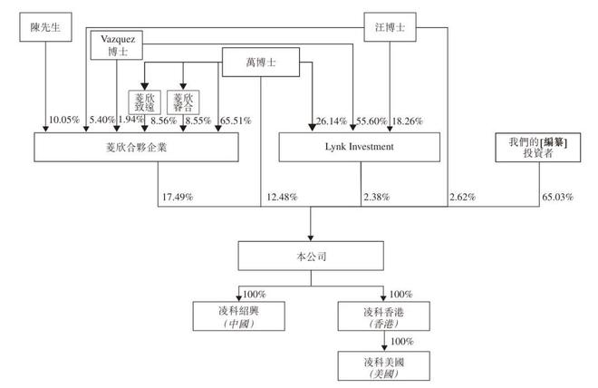 IPO前,万昭奎博士持股12.48%,汪俊博士持股为2.62%,菱欣合伙企业持股为17.49%,Lynk Investment持股2.38%,一共持股为34.97%。