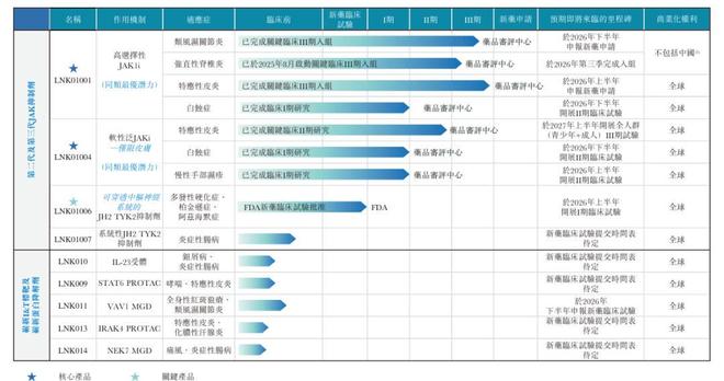 截至最后实际可行日期,凌科药业核心产品包括LNK01001,一款高选择性、有潜力成同类最佳的第二代JAK1抑制剂,以及LNK01004,一款有潜力成为同类首创的第三代软性泛JAK抑制剂,靶向自身免疫及炎症疾病。