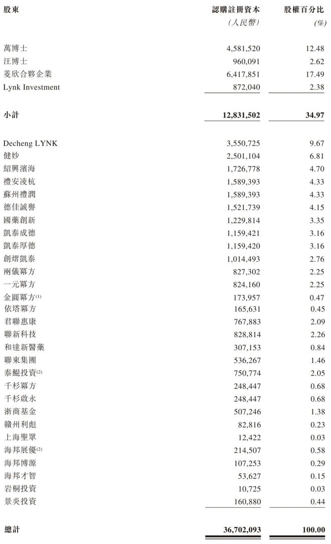 Decheng LYNK持股为9.67%,健妙持股为6.81%,绍兴滨海持股为4.7%,礼安凌杭、苏州礼润分别持股为4.33%,德佳诚誉持股为4.15%,国药创新持股为3.35%,凯泰成德、凯泰厚德分别持股为3.16%,创熠凯泰持股为2.76%,两仪幂方、一元幂方分别持股为2.25%;