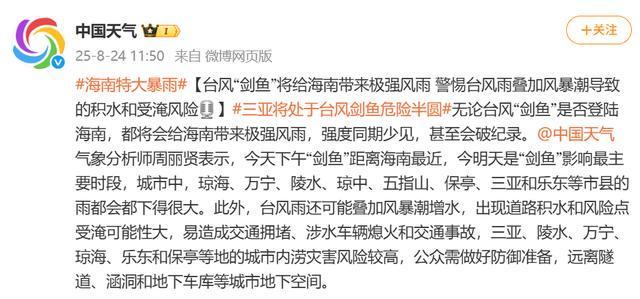 据@中国天气消息,无论台风“剑鱼”是否登陆海南,都将会给海南带来极强风雨,强度同期少见,甚至会破纪录。中国天气气象分析师周丽贤表示,今天下午“剑鱼”距离海南最近,今明天是“剑鱼”影响最主要时段,城市中,琼海、万宁、陵水、琼中、五指山、保亭、三亚和乐东等市县的雨都会都下得很大。此外,台风雨还可能叠加风暴潮增水,出现道路积水和风险点受淹可能性大,易造成交通拥堵、涉水车辆熄火和交通事故,三亚、陵水、万宁、琼海、乐东和保亭等地的城市内涝灾害风险较高,公众需做好防御准备,远离隧道、涵洞和地下车库等城市地下空间。