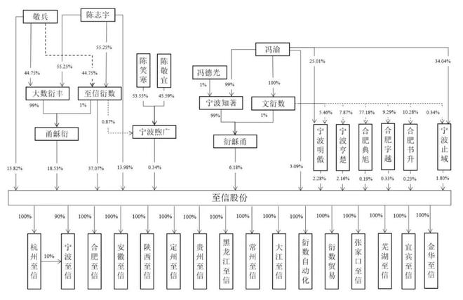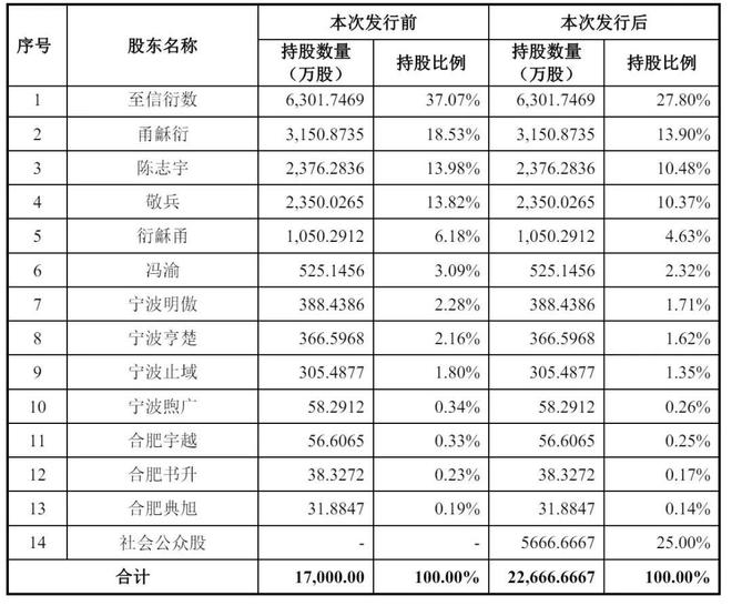 IPO前,至信衍数持股37.07%,甬龢衍持股18.53%,陈志宇持股13.98%,敬兵持股13.82%,衍龢甬持股为6.18%,冯渝持股为3.09%。
