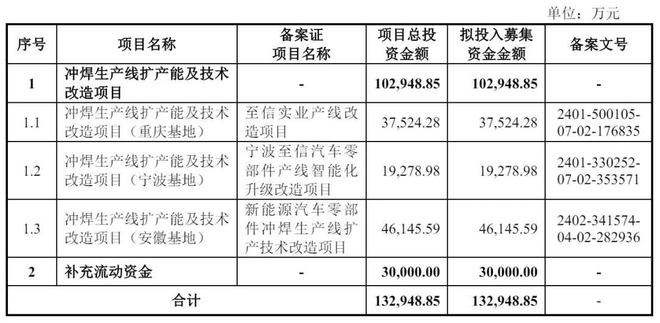 至信股份计划募资13.3亿元,其中,10.3亿元用于冲焊生产线扩产能及技术改造项目,3亿元用于补充流动资金。