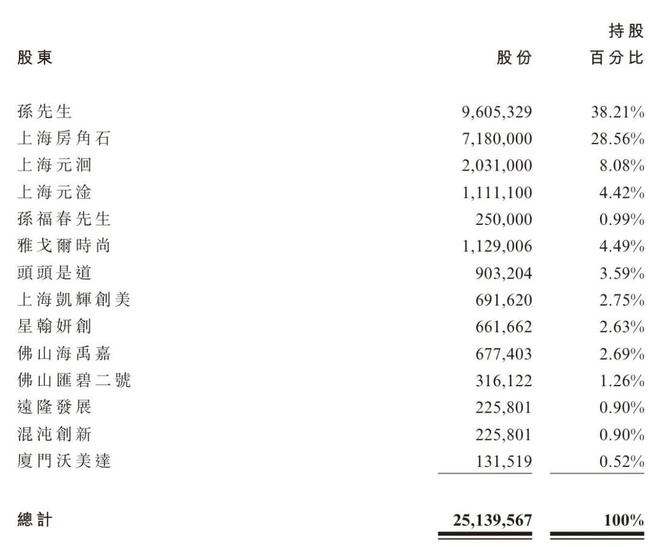 IPO前,孙来春直接持股为38.21%,上海房角石持股为28.56%,上海元洄持股为8.08%,上海元淦持股为4.42%,孙福春持股为0.99%;