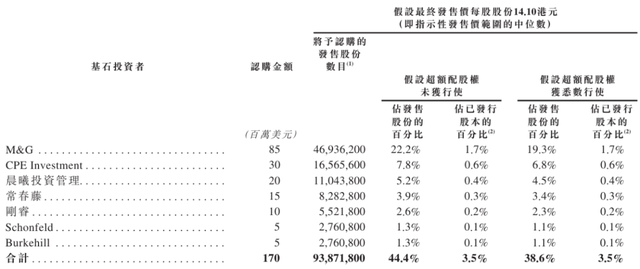 其中,M&G持股为8500万美元,CPE Investment持股为3000万美元,晨曦投资管理持股为2000万美元,常春藤持股为1500万美元,刚睿持股为1000万美元,Schonfeld、Burkehill分别持股为500万美元。