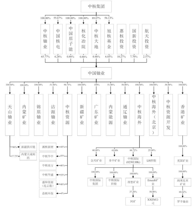 中核集团通过中核铀业、旭核基金、中国核电、中国原子能、核化冶院、中核大地合计间接控制中国铀业79.48%股份,为中国铀业实际控制人。