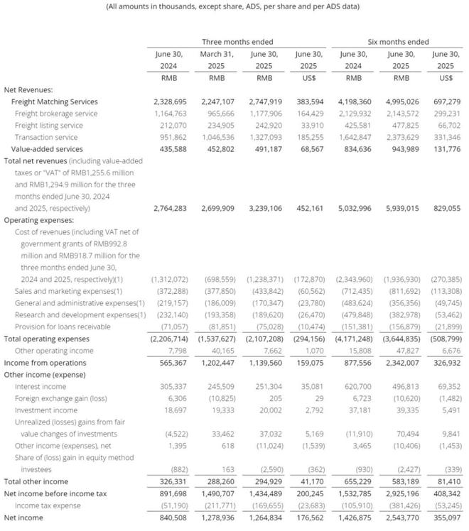 满帮2025年第二季度营收为32.39亿元(约4.52亿美元),运营利润为11.4亿元,净利为12.65亿元。