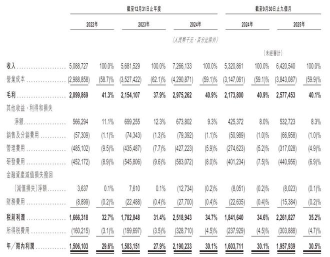 招股书显示,三环集团2022年、2023年、2024年营收分别为50.89亿元、56.82亿元、72.66亿元;毛利分别为21亿元、21.54亿元、29.75亿元;毛利率分别为41.3%、37.9%、40.9%;期内利润分别为15.06亿元、15.83亿元、21.9亿元;期内利润率分别为29.6%、27.9%、30.1%。