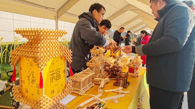 市集不仅有淄博本地特色,还迎来了周边城市济南、东营、滨州的“客人”。来自东营的杨雷带来了市级非遗杨氏扎刻榫卯作品,蝈蝈笼子、灯笼等物件构思巧妙,通体不用一颗钉子,全靠秸秆竹条通过剪、削、雕、刻、咬合等手法拼接而成,再现了宋代木工榫卯与竹扎技术的精髓。“这手艺太神奇了,比机器做的还精致!”市民围着展品啧啧称奇。杨雷笑着说:“这次来市集是想让更多人了解扎刻技艺,也欢迎淄博朋友到东营看看。”跨城好物的加入,让市集成为城市间文化交流的小窗口。