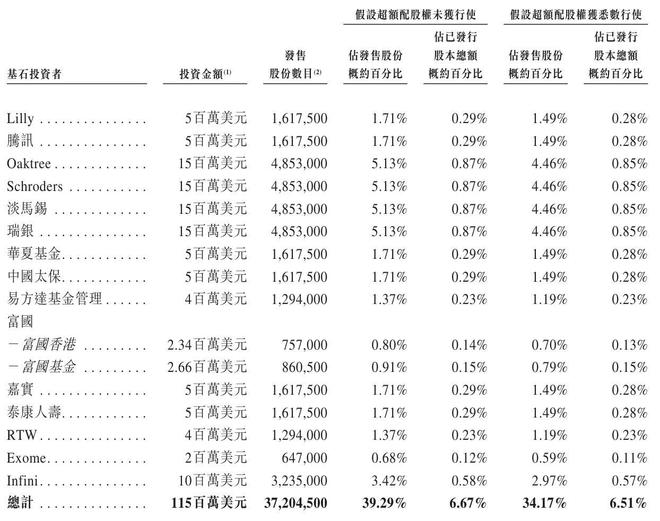 英硅智能基石投资者分别为Lilly、腾讯、Oaktree、Schroders、淡马锡、瑞银、华夏基金、中国太保、易方达基金管理、富国、嘉实、泰康人寿、RTW、Exome、Infini,一共认购1.15亿美元。