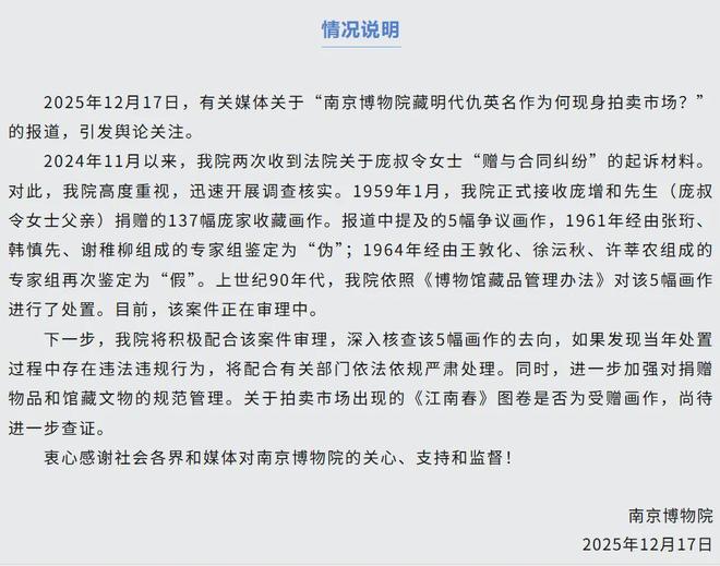对此,12月17日晚,南京博物院发布情况说明:2024年11月以来,该院两次收到法院关于庞叔令女士“赠与合同纠纷”的起诉材料。经核查,1959年1月,该院正式接收庞增和先生(庞叔令女士父亲)捐赠的137幅庞家收藏画作。报道中提及的5幅争议画作,1961年经由张珩、韩慎先、谢稚柳组成的专家组鉴定为“伪”;1964年经由王敦化、徐沄秋、许莘农组成的专家组再次鉴定为“假”。上世纪90年代,该院依照《博物馆藏品管理办法》对该5幅画作进行了处置。目前,该案件正在审理中。