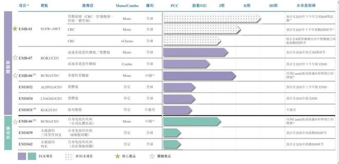 岸迈生物的肿瘤学业务管线包括三款处于临床阶段的候选药物,包括核心产品EMB-01(靶向EGFR/cMET),用于治疗结直肠癌,两款基于T细胞衔接器的关键产品EMB-06(靶向BCMA/CD3),用于治疗多发性骨髓瘤(「MM」)和EMB-07(靶向ROR1/CD3),用于治疗淋巴瘤及实体瘤,及三款基于T细胞衔接器的临床前候选药物EM1032(靶向ALPP(G)/CD3)、EM1034(靶向LY6G6D/CD3)和EM1031(靶向KLK2/CD3)。