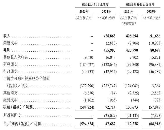 招股书显示,岸迈生物2023年无营收,2024年营收为4.59亿元,岸迈生物2023年、2024年年内利润分别为-5.95亿元、4769万元。