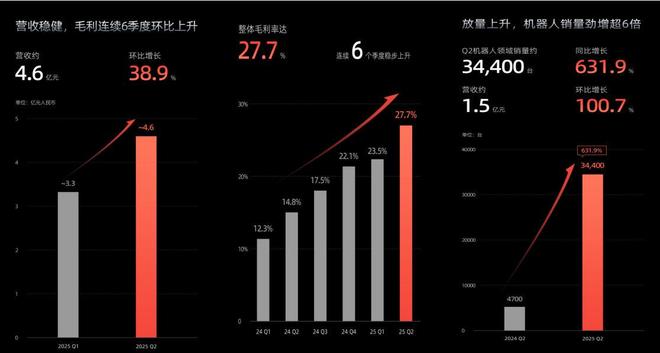 RoboSense速腾聚创产品整体毛利率从2024年第一季度的12.3%提升至27.7%,已连续六个季度环比上升,其中机器人领域毛利率达41.5%。