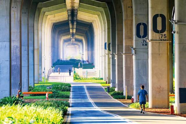 深圳前海慢行步道,利用高速天桥下方空间,改造成市民游客骑行游乐的好去处,也是深圳山海连城绿道的一部分。图/深圳宝安区委宣传部供