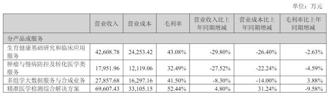 财报显示,华大基因2025年上半年来自生育健康基础研究和临床应用服务收入为4.26亿元,较上年同期下降29.8%;来自肿瘤与慢病防控及转化医学类服务收入为1.8亿元,较上年同期下降27.52%;来自多组学大数据服务与合成业务收入为2.79亿元,较上年同期下降8.3%。