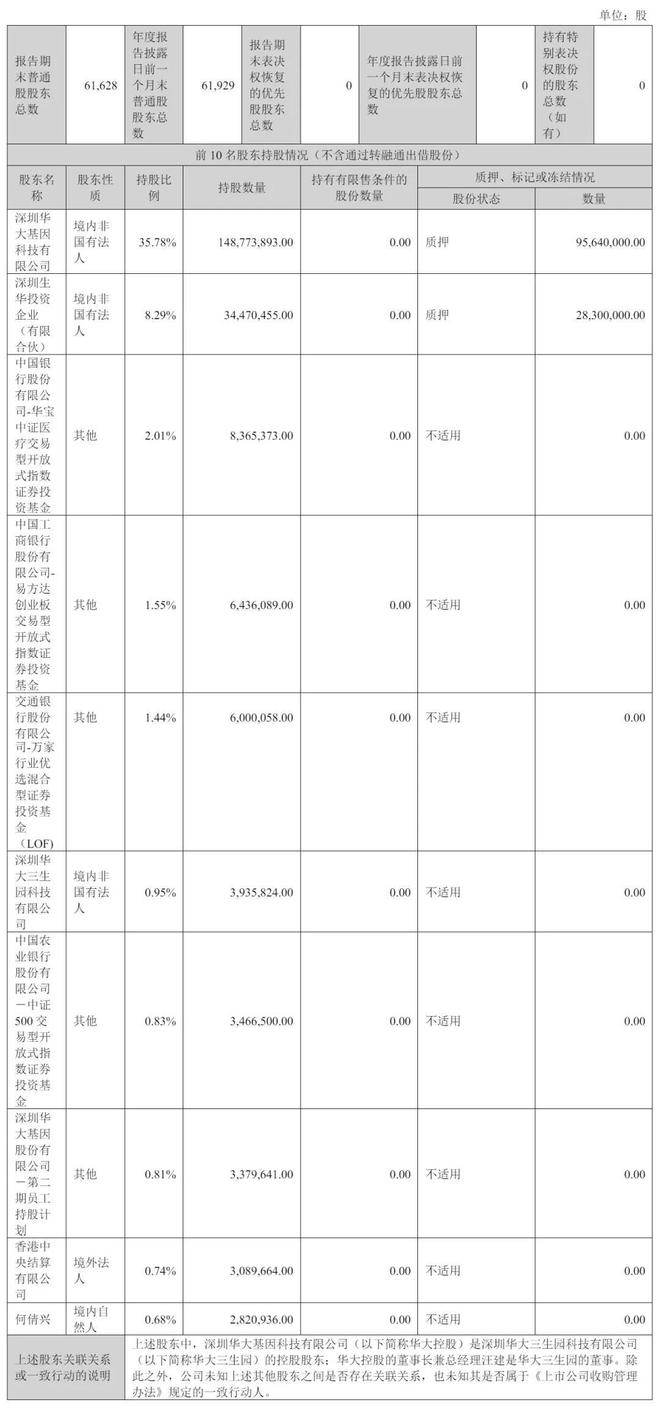截至2024年12月31日,深圳华大基因科技有限公司持股为35.78%,深圳前海华大基因投资企业(有限合伙)持股为8.29%;