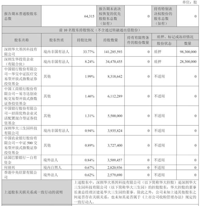 截至2025年6月30日,深圳华大基因科技有限公司持股为33.77%,深圳前海华大基因投资企业(有限合伙)持股为8.24%;
