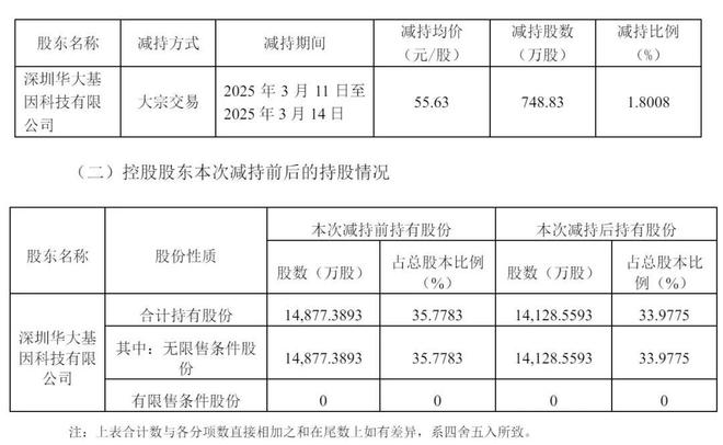 华大控股是2025年3月11日至2025年3月14日进行减持,减持均价为55.63元,减持748.83万股,套现4.2亿元。华大控股是华大基因创始人汪建全资持有的企业,这意味着汪建套现4.2亿元。