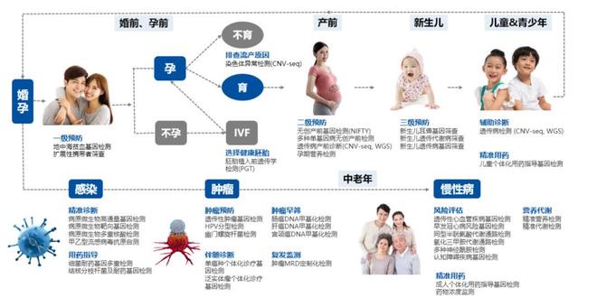 华大基因在生育健康领域,提供了完整的“五前”母婴健康管理产品体系,覆盖婚前、孕前、产前、新生儿及儿童成长阶段;在肿瘤防控方面,形成了围绕肿瘤的“预、筛、诊、监”全生命周期闭环管理,提供各阶段、全方位检测服务;