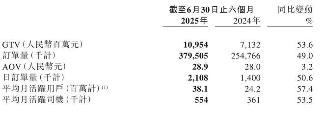 截至2025年6月30日止六个月,曹操出行的总订单量达3.795亿单,较去年同期2.548亿单增加49.0%。
