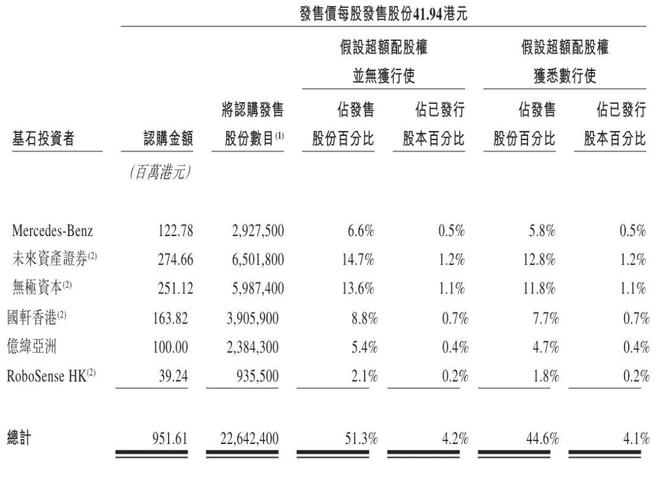 曹操出行本次IPO引入6名基石投资者,分别为梅赛德斯-奔驰、未来资产证券(香港)、无极资本、国轩高科(香港)、亿纬亚洲和速腾聚创,一共认购9.52亿港元。