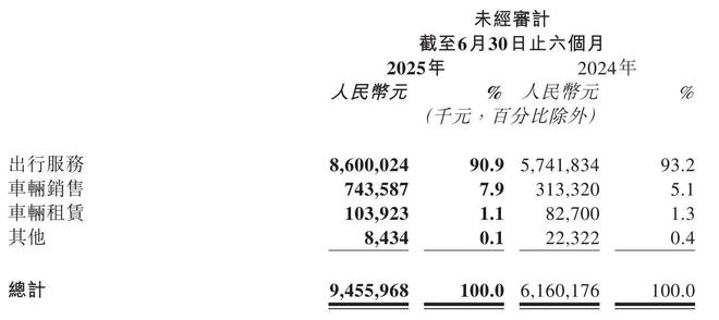 曹操出行2025年上半年来自出行服务的收入为86亿元,占营收的比例为90.9%;来自车辆销售收入为7.43亿元,占营收的比例为7.9%;来自车辆租赁服务收入为1.04亿元,占比为1.1%。