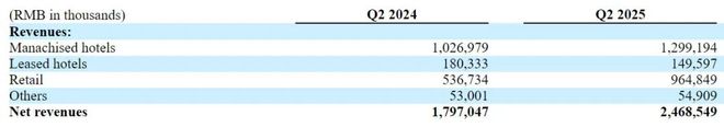 亚朵集团2025年第二季度租赁酒店(Leased hotels)收入为1.5亿元(约2088万美元),上年同期为1.8亿元;零售收入为9.65亿元(约1.35亿美元),上年同期为5.37亿元。